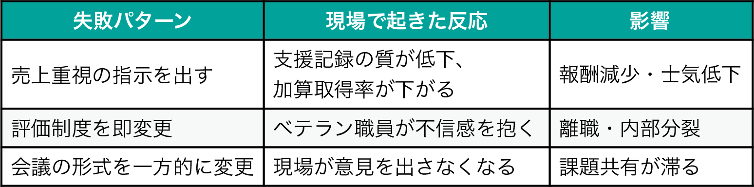 他業種の経営ノウハウは福祉事業でも活かせますが、やり方をそのまま持ち込むと逆効果です。特に「数字管理」「KPI」「効率化」を強調しすぎると、福祉現場では“人を見ていない”と受け取られます。