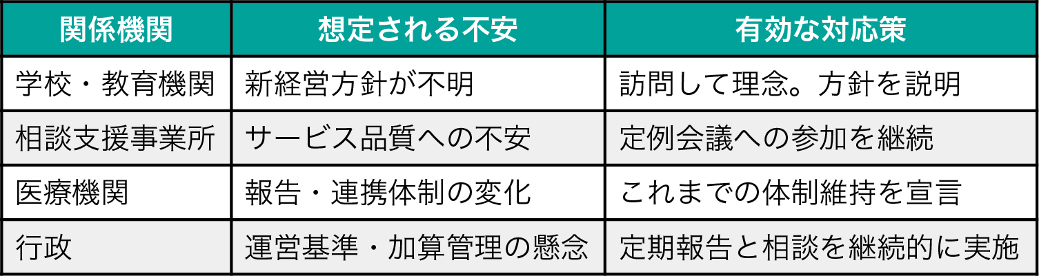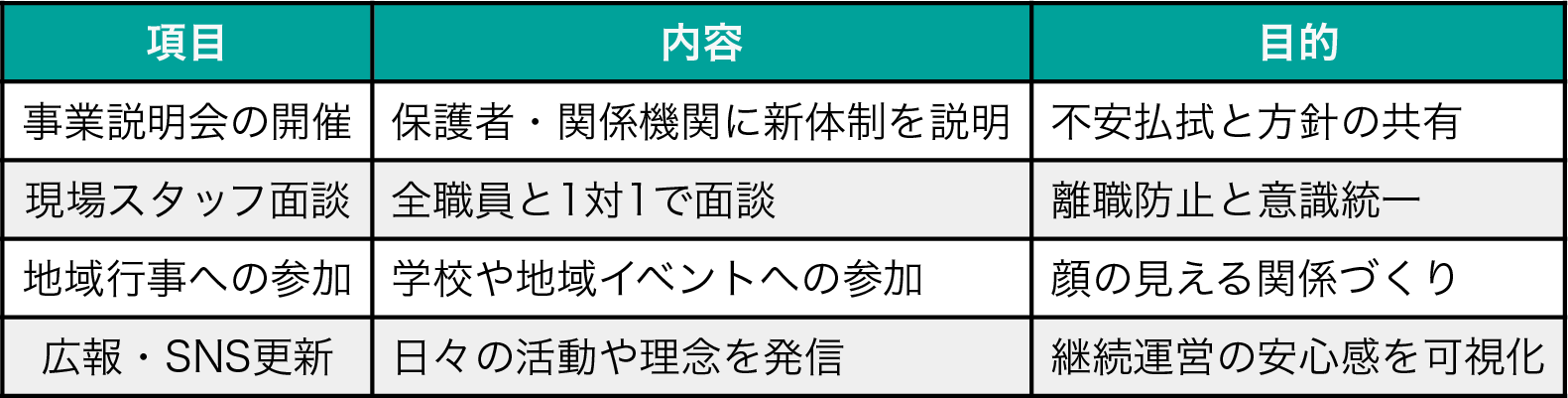 M&A後の新体制では、「自分たちの色を出したい」という思いが先行しがちです。しかし、利用者や保護者が求めているのは“新しさ”ではなく“継続の安心”。安心感を明確に示すことが、信頼回復の第一歩となります。